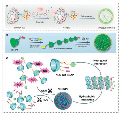 Figure 6 (A) Schematic diagram illustrating the design of the supramolecular DAS@CD-OxPt (Ⅳ) NPs for CRC chemo-immunotherapy. Reproduced with permission [69]. Copyright 2024, Wiley-VCH Verlag. (B) Synthetic routes of CD-S-CPT and scheme illustration of the processes involved in supramolecular NPs (SNPs) preparation. Reproduced with permission [73]. Copyright 2022, John Wiley and Sons Ltd. (C) The synthesis pathway of NLG-CD-SNAP and the specific responsive activation of NCSNP. Reproduced with permission [74]. Copyright 2024, Wiley-VCH Verlag.