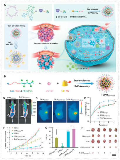 Phototherapy, as an emerging clinical treatment for tumors, holds great potential as an adjunct for cancer immunotherapy [125]. Recently, numerous studies have focused on the combination of phototherapy with immunotherapetic strategies. For example, Qi et al. reported supramolecular cell membrane vesicles (SCMVs) (Fig. 10C) [126], that effectively encapsulated adamantane (Ad)-modified indocyanine green (Ad-ICG) within β-CD through host-guest interactions to achieve PDT. By co-delivering the indoleamine 2, 3-dioxygenase (IDO) inhibitor in the cavity and encapsulating the Toll-like receptor 7 and 8 (TLR7/8) agonist resiquimod (R848) within the SCMV, they were able to re-polarize tumor-associated macrophages (TAMs) towards the M1 phenotype. This innovative design empowers the vesicles synergistic effects of PDT and immunotherapy to suppress tumors, while significantly enhancing the therapeutic efficacy of immune checkpoint blockade therapy.