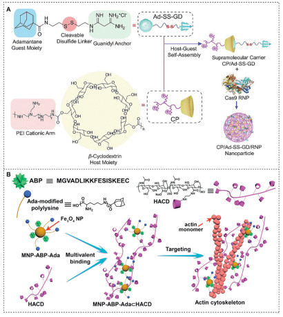 Figure 8 (A) Schematic diagram of construction process of CP/Ad-SS-GD/RNP supramolecular nanoassemblies. Reproduced with permission [108]. Copyright 2020, Elsevier. (B) Schematic diagram for preparation of MNP-ABP-Ad/HACD supramolecular nanofibers for targeting actin cytoskeleton. Reproduced with permission [110]. Copyright 2020, American Chemical Society.