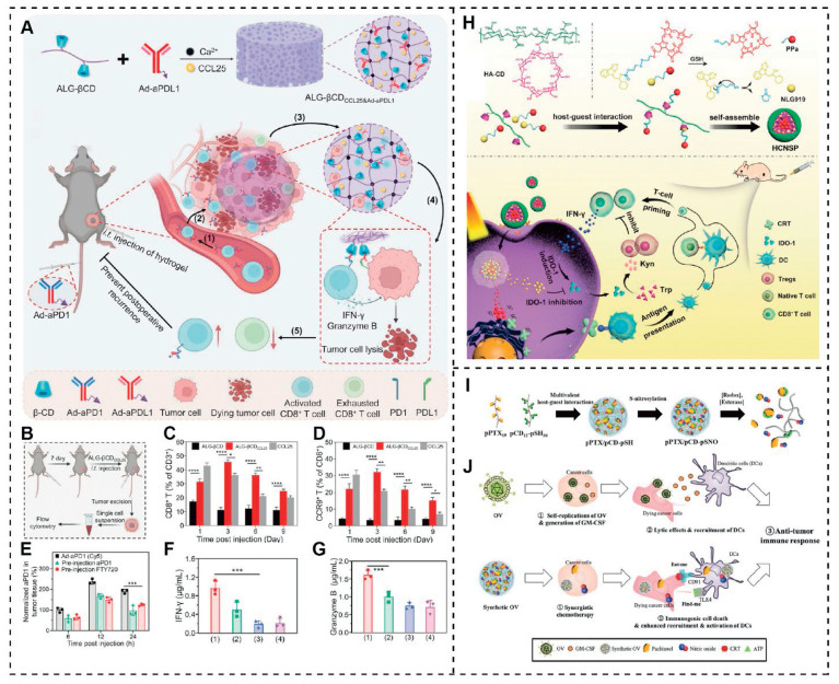 For instance, Zhu et al. designed a hydrogel composed of in situ-formed β-CD-modified alginate (ALG-βCD), named the RER-T system. This hydrogel encapsulated the chemokine C—C motif chemokine ligand 25 (CCL25) through supramolecular interactions, which selectively recruits the CCR9+CD8+ T cells with potent anti-tumor activity. Moreover, the cavity of β-CD bonded to the adamantine-modified anti-PDL1 antibody (Ad-aPDL1) through host-guest interactions. Through intravenous injection of the anti-PD1 antibody (Ad-aPD1), it can be further anchored into the ALG-βCD hydrogel. Ad-aPDL1 and Ad-aPD1 could promote the binding between CD8+ T cells and tumor cells. This strategy enhances the activation and tumoricidal capabilities of T cells and the efficacy of T cell-mediated immunotherapy (Fig. 9A) [117]. After intratumoral injection (i.t.) of the RER-T system, a greater number of T cell subsets (CCR9+CD8+) were recruited to the tumor tissue (Figs. 9B–D). Consequently, there was an approximately twofold increase in the concentration of Ad-aPD1 within the tumor (Fig. 9E), enhancing the affinity of CD8+ T cells for tumor cells and consequently elevating interferon gamma (IFN-γ) production (increased by 5.14-fold, Fig. 9F) and granzyme B (increased by 2.27-fold, Fig. 9G), ultimately enhancing the cytotoxicity of CD8+ T cells against tumor cells.