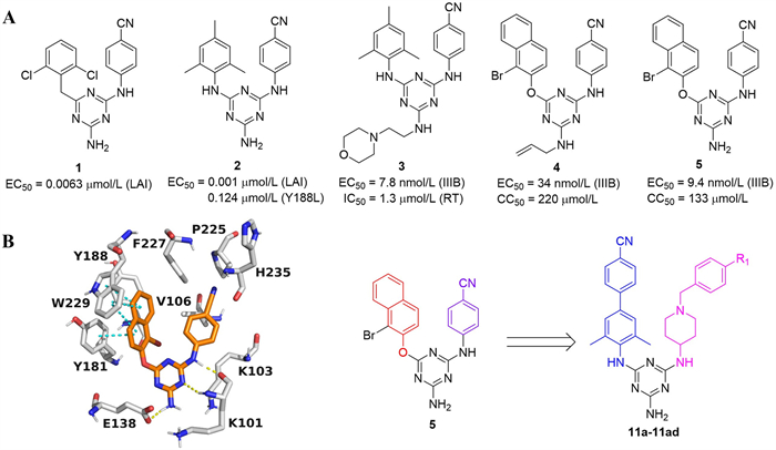 In 2001, Janssen and co-workers reported the discovery of a triazine-containing NNRTI, namely compound 1. This compound exhibited potent inhibitory activity against HIV-1 (50% effective concentration (EC50) = 0.0063 µmol/L, Fig. 1A) [19]. Over the subsequent decades, several series of optimizations and structural modifications based on compound 1 were carried out for a continuous and in-depth exploration [2026]. Compound 2 was acquired through the modification of the linker and the aromatic ring at the C-4 position of triazine. It demonstrated potent inhibitory activity against HIV-1 (EC50 = 0.001 µmol/L). Nevertheless, its activity against the Y188L mutant strain declined sharply (EC50 = 0.124 µmol/L). Subsequently, by targeting the entrance channel of the non-nucleoside reverse transcriptase inhibitor binding pocket (NNIBP) and modifying the C-6 position of triazine, compound 3 was discovered (EC50 = 0.0078 µmol/L) [27]. To enhance the π-π stacking interactions between the ligand and the highly conserved hydrophobic region (W229), the phenyl group was substituted with a naphthyl moiety, affording compound 4. This compound exhibited moderate anti-HIV-1 activity (EC50 = 34 nmol/L) along with low cytotoxicity (50% cytotoxic concentration (CC50) = 220 µmol/L) [28]. Removal of the allyl group yielded compound 5, which had enhanced antiviral activity (EC50 = 9.4 nmol/L) against the wild-type (WT) HIV-1 [29]. Nonetheless, this analog showed unsatisfactory activity against mutant strains [3032]. Thus, the development of novel triazine-based derivatives with increased antiviral activity against both WT and mutant strains continues to be a critical priority.
