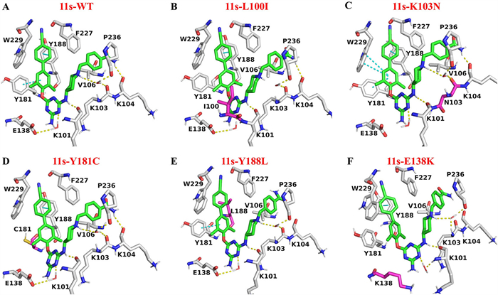 Figure 2  The docking results of 11s with HIV-1 RT. (A) 11s with WT, (B) 11s with L100I, (C) 11s with K103N, (D) 11s with Y181C, (E) 11s with Y188L, and (F) 11s with E138K. The protein carbon atoms were depicted in gray, mutant residues were depicted in purple and 11s was presented in green. Dashed yellow lines represent the hydrogen-bonding interactions. Dashed pink lines represent the π-π interaction.