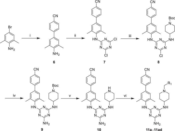 Scheme 1  Reagents and conditions: (ⅰ) 4-cyanophenylboronic acid, Pd(dppf)Cl2, Cs2CO3, 1,4-dioxane:H2O = 2:1, N2, reflux, 12 h; (ⅱ) cyanuric chloride, K2CO3, 1,4-dioxane, r.t., 2 h; (ⅲ) 4-amino-1-Boc-piperidine, K2CO3, 1,4-dioxane, r.t., 3 h; (ⅳ) NH3·H2O, tetrahydrofuran (THF), 100 ℃, 12 h; (ⅴ) CF3COOH (TFA), dichloromethane (DCM), r.t., 0.5 h; (ⅵ) corresponding benzyl bromide or chloride, K2CO3, N,N-dimethylformamide (DMF), r.t., 2–6 h.