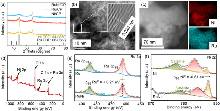 • Figure 1  (a) XRD pattern of RuNi/CP, Ru/CP, and Ni/CP. (b) HRTEM images and (c) HAADF-STEM image and elemental mapping images of RuNi. (d) XPS survey spectra of RuNi, (e) Ru 3p region of Ru and RuNi, (f) Ni 2p region of Ni and RuNi.