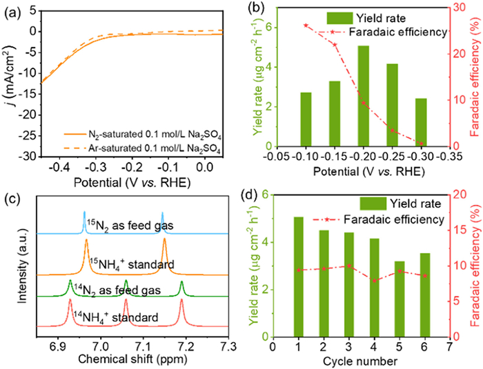 Figure 2  (a) LSV curves of RuNi at different atmosphere. (b) NH3 yield rate and corresponding FE at each applied potential. (c) 1H NMR spectra of the products after electrolysis at −0.2 V vs. RHE using different feed gases. (d) The cycling tests of electrochemical NRR by RuNi.