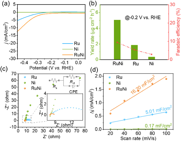 Figure 3.  (a) LSV curves of Ru, Ni, and RuNi in N2-saturated 0.1 mol/L Na2SO4. (b) Comparison of NH3 yield rate and corresponding FEs of different catalysts. (c) EIS (inset: the equivalent circuit) and (d) ECSA profiles of N2 electrolysis on Ru, Ni, and RuNi.