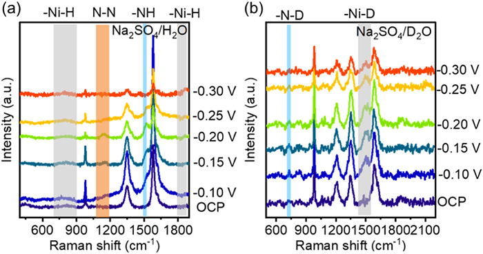 Figure 4  In situ surface enhanced Raman spectra on RuNi under N2 atmosphere: (a) Na2SO4/H2O and (b) Na2SO4/D2O.