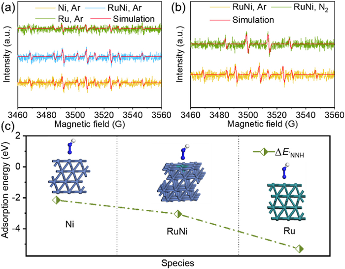 Figure 5.  (a) EPR spectra of different samples under Ar. (b) EPR spectra of RuNi under different gases. (c) Calculated adsorption energies of *N2H values of various systems, including the Ni, RuNi and Ru surfaces.
