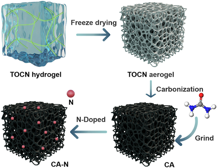 Figure 1. The synthesis process of preparing nitrogen-rich doped carbon aerogel using cellulose as the carbon source.Figs. 2a–c display the microstructure of CA, CA-N4, and CA-N5, respectively. It is evident that the carbon nanofibers are interconnected to form a 3D network structure, demonstrating that the 3D structure is well-preserved through the freeze-drying method. The carbon aerogels are composed of nanofibers with a high aspect ratio, with lengths of approximately 1–2 µm and diameters of about 5 nm. After heat treatment with urea, the 3D network structure of the carbon aerogels remains intact, and the structure becomes denser as the N content increases. In CA-N5, some flake-like structures can be observed, which may be attributed to the increased amount of urea providing additional carbon and nitrogen elements to compensate for any element loss during the treatment process [12]. Based on the electronic scanning diagram of the CA-N4 sample (Fig. 2d), Figs. 2e-g exhibit the element distribution of CA-N4. The presence of C, N, and O elements is clearly visible, and the distribution of nitrogen elements is relatively uniform, indicating that nitrogen can be successfully doped into the carbon aerogel through heat treatment of CA with urea.