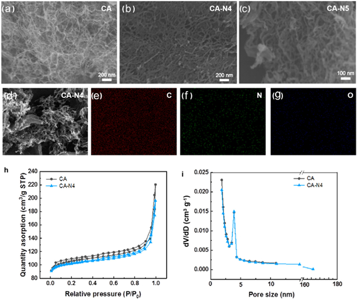 Figure 2. SEM image of (a) CA, (b) CA-N4, (c) CA-N5. An additional SEM image of (d) CA-N4 along with its corresponding element mapping images for (e) carbon (C), (f) nitrogen (N), and (g) oxygen (O). (h) N2 adsorption/desorption isotherms and (i) Barrett-Joyner-Halenda (BJH) pore size distributions for CA and CA-N4.To investigate the alterations in the pore structure of carbon aerogels following nitrogen doping, we conducted nitrogen adsorption and desorption tests on both pristine carbon aerogels and their nitrogen-doped counterparts. Fig. 2h illustrates that both samples exhibit characteristics of mesoporous materials. The pure carbon aerogel boasted a specific surface area of 334.6 m2/g and a pore volume of 0.30 cm3/g, while the nitrogen-doped variant, designated as Ca-N4, exhibited a slightly reduced specific surface area of 320.6 m2/g and a pore volume of 0.28 cm3/g. These findings underscore the inherently rich pore structure and high specific surface area of carbon aerogels.
