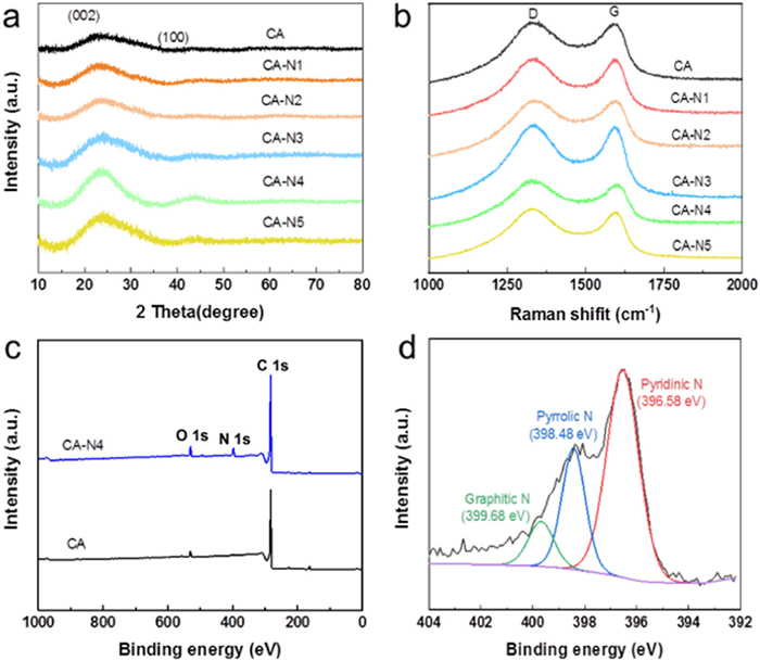 To further investigate the impact of nitrogen doping on the characteristics of carbon aerogels, the samples were analyzed using X-ray diffraction (XRD) and Raman spectroscopy, as presented in Fig. 3. The XRD patterns (Fig. 3a) reveal broad peaks at approximately 23.4° and 45.3°, which correspond to the (002) and (100) graphite planes, respectively. This indicates a low degree of graphitization within the carbon materials [33]. Fig. 3b displays the Raman spectra of the carbon aerogel (CA) and nitrogen-doped carbon aerogel (CA-N) samples. The D-band at 1335 cm-1 represents lattice defects and disorder in the carbon atoms, while the G-band at around 1590 cm-1 indicates the symmetry and crystallinity of the carbon atoms. The ratio of the intensities of the D-band to the G-band (ID/IG) reveals the degree of disorder in the material. The ID/IG values for CA, CA-N3, and CA-N4 are 2.27, 2.53, and 3.01, respectively. This increase in disorder is attributed to the nitrogen doping process, which may disrupt the sp2 carbon plane, leading to an increase in disordered carbon.