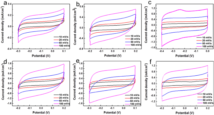 To study the electrochemical properties of the materials, a three-electrode test system with 6 mol/L KOH as the electrolyte was employed to test CA (pure carbon) and CA-N. Fig. 4 presents the CV curves of each sample recorded at various scanning rates. Fig. 4a shows that the CV curve of pure carbon CA exhibits a rectangular shape, which is characteristic of ideal capacitive behavior. Figs. 4b-f display the CV curves of CA-N, which also maintain a rectangular shape, indicating that it exhibits typical double-layer capacitance. The energy storage mechanism of these capacitors is based on physical energy storage, involving electron transport within the electrode and ion transport at the interface between the electrolyte and the electrode. At scanning rates ranging from 10 mV/s to 100 mV/s, the CV curves of all samples retain good symmetry and a rectangular shape, demonstrating that CA-N possesses good electrical conductivity. Generally, the area under the CV curve is indicative of the specific capacitance of the material. As shown in Figs. 4b–f, the area of the CV curve increases with the amount of urea used during heat treatment, suggesting that the specific capacitance of the electrode material also increases accordingly.