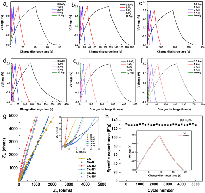 As shown in Fig. 5g, the ion diffusion resistance of CA-N samples after nitrogen doping is smaller compared to the pristine CA sample. This observation suggests that nitrogen doping helps to improve the conductivity of carbon aerogels, reduce the internal resistance, and enhance the ion transport efficiency. These improvements contribute to the enhanced electrochemical performance of the nitrogen-doped carbon aerogels. In summary, the EIS results confirm that nitrogen doping of carbon aerogels leads to reduced internal resistance, improved conductivity, and more efficient ion transport, all of which are beneficial for enhancing the electrochemical performance of supercapacitors.