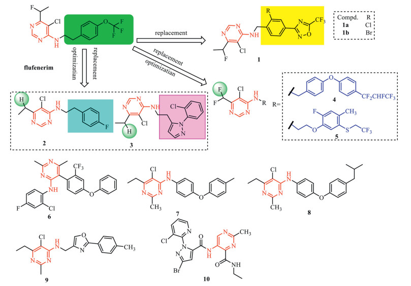 Despite the threat flufenerim poses to honeybee reproduction and survival, its low toxicity, high insecticidal activity, and ease of structural modification have made it a popular choice for researchers looking to develop new pesticides [19]. For instance, Liu et al. [20] synthesized a series of pyrimidinamine compounds by modifying the structure of flufenerim to give compound 1. This compound 1 (Fig. 2) showed good insecticidal activity against Mythimna separata, Aphis medicagini, and Tetranychus cinnabarinus, with median lethal concentration (LC50) values of 3.6 and 4.2 mg/L against Mythimna separata, respectively. The conformational relationship indicated that the structural R had a significant impact on insecticidal activity, with the activity trend being Cl > Br > H. Molecular docking results revealed that compounds 1a and 1b (Fig. 2) have a similar mode of action to flufenerim, binding at the acetylcholine receptor, but docked in an opposite manner to flufenerim at the acetylcholinesterase (AChE) active site. Uneme et al. [21] designed and synthesized compound 2 (Fig. 2) by connecting the amino group on the parent body of flufenerim with 2-(4-fluorophenyl)ethyl. It demonstrated good insecticidal activity against Adoxophyes orana Fisher, Nilaparvata lugens (Stal), and Aphis gossypi at a concentration of 500 mg/L, all with lethality exceeding 90%. Additionally, compound 3 (Fig. 2) was found to have excellent activity against Myzus persicae (Sulzer) by replacing a part of the structure of flufenerim with a phenylpyrazole fragment [22]. It exhibited 100% lethality against Myzus persicae (Sulzer) at concentrations of 600 mg/L and 100 mg/L, and still had 88% lethality at 10 mg/L. Li et al. [23,24] conducted molecular substitution and optimization of substituents attached to the amino position on the molecular structure of flufenerim. They discovered that compound 4 (Fig. 2) had superior controlling efficacy against Tetranychus cinnabarinus. At a concentration of 100 mg/L, the lethality of compound 4 against Tetranychus cinnabarinus was 97%, which was higher than that of the control propargite (80%). Furthermore, compound 5 (Fig. 2) showed good insecticidal activity against cotton Tetranychus cinnabarinus (LC50=1.02 mg/L), which was comparable to the control cyenopyrafen.
