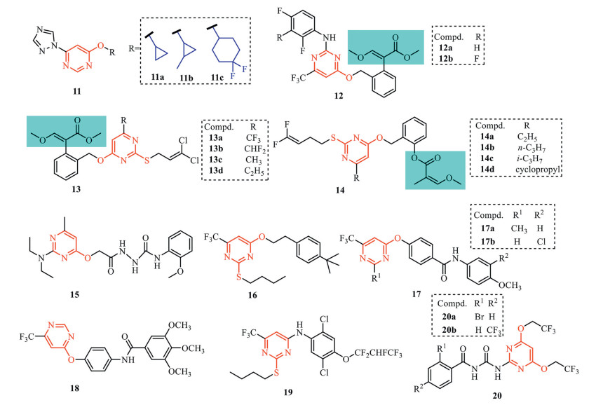 The introduction of heterocyclic and active molecular fragments into the pyrimidine structure is a common approach for the discovery of compounds with outstanding activity. Nokura et al. [28] introduced a triazole group at position 6 of the pyrimidine ring and optimized the molecular fragment substitution of the moiety attached to the methoxy linkage at position 4 of the pyrimidine ring, and synthesized the majority of the compounds with good insecticidal activity against Bemisia tabaci and Aphis gossypi. Among them, compound 11 (Fig. 3) showed a lethality of more than 90% against both Bemisia tabaci and Aphis gossypi at a concentration of 500 mg/L. The compounds were also found to have good insecticidal activity against the tobacco louse and the cotton aphid. In addition, the methoxyacrylate moiety has good bactericidal activity due to the methoxyacrylate group [29]. The Shenyang Research Institute of Chemical Industry introduced the β-methoxyacrylate group into the pyrimidine structure, resulting in compound 12 with excellent insecticidal activity against Tetranychus cinnabarinus and a bactericidal effect [30]. At a concentration of 0.626 mg/L, the lethality of compounds 12a and 12b (Fig. 3) against Tetranychus cinnabarinus was 90% and 95%, respectively, which was superior to that of the control agent pyriminostrobin. Meanwhile, compound 13 (Fig. 3) [31] exhibited excellent acaricidal activity against Tetranychus cinnabarinus. Among them, the larvicidal and ovicidal activities of compound 13a (Fig. 3) were almost twice those of fluacrypyrim at a concentration of 4 mg/L. The field test results showed that at a concentration of 100 mg/L, compound 13a had effectiveness of 96.61%, 97.36%, 96.25%, and 81.02% against citrus red mites after treating the crops for 3, 7, 10, and 20 days. It is notable that compound 13a demonstrated persistent, rapid, and effective control of Panonychus citri, with relatively low acute toxicity to mammals, birds, and bees. The conformational relationship indicated that the R substituent group on the pyrimidine structure had a more significant influence on the acaricidal activity, with an activity trend of CF3 > CHF2 > CH3 > C2H5. Compound 14 (Fig. 3) [32] exhibited good inhibitory activity against Tetranychus cinnabarinus and Aphis craccivora Koch, with 100% lethality at a concentration of 500 mg/L. Compound 15 (Fig. 3) [33] showed a significant effect against Aedes aegypti, with 70% lethality at a concentration of 2 mg/L.
