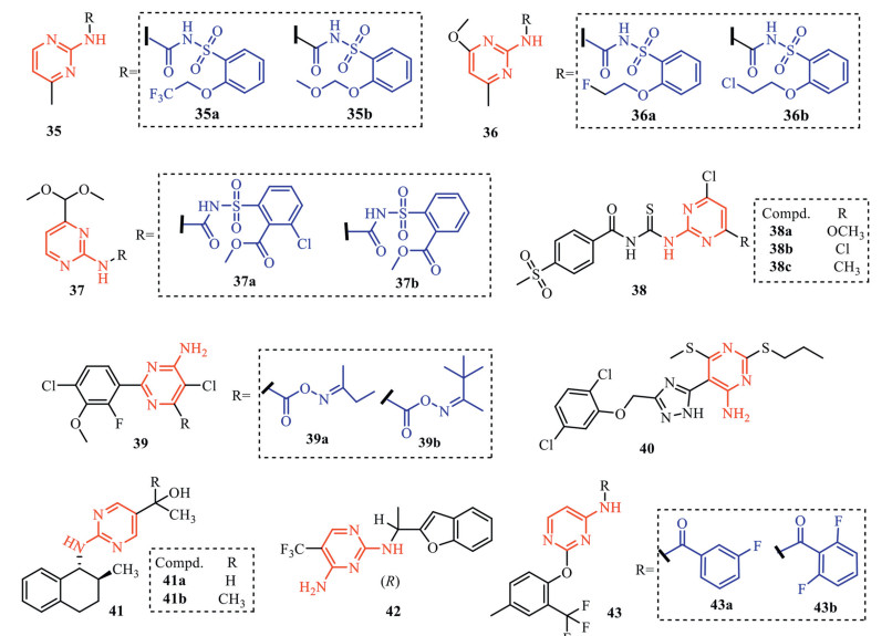 Amidosulfuron, bensulfuron-methyl, and chlorimuron-ethyl are herbicide pesticides with a pyrimidine amine structure. They all contain a sulfonylurea bridge structure, which inhibits the synthesis of amino acids during plant metabolism to achieve the herbicidal effect [56]. By introducing a sulfonylurea molecular fragment at position 2 of the pyrimidine ring, Pan et al. [57] enhanced the inhibitory activity of compound 35 (Fig. 4) against oilseed rape and Amaranthus retroflexus L. Compound 36 (Fig. 4) [58] showed higher herbicidal activity against monocotyledonous weed species compared to the commercial pesticides triasulfuron and nicosulfuron. With a dosage as low as 7.5 g/ha, compound 36a (Fig. 4) demonstrated strong herbicidal effects on Echinochloa crus-galli (L.) P. Beauv. and Digitaria sanguinalis in peanut fields, both pre-emergence and post-emergence. This compound could be a promising candidate for herbicides in peanut cultivation. Additionally, compound 37 (Fig. 4) exhibited 100% pre-emergence inhibitory activity against kale-type Brassica napus L. at a dose of 75 g (ai)/ha, comparable to monosulfuron and chlorsulfuron herbicides [59]. Compound 38 (Fig. 4) exhibited strong herbicidal activity against Digitaria sanguinalis L. and Amaranthus retroflexus L. Compound 38a (Fig. 4) inhibited oilseed rape root growth by 81.5% at 100 mg/L, outperforming the control tribenuron-methyl. Compound 38b (Fig. 4) showed an 81% inhibition rate on Digitaria sanguinalis L. root growth, surpassing the control bensulfuron. The study suggested that a small R substituent on the pyrimidine ring was advantageous for enhancing herbicidal activity, with the activity trend of compound 38 being Cl > OCH3 > CH3 [60].