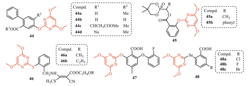 Zhang [71] introduced diaryl ethers to the methoxypyrimidine ring, resulting in the discovery of compound 45 (Fig. 5) with significant post-emergence herbicidal activity against monocotyledonous plants at a dose of 112.5 g (ai)/ha. Furthermore, due to their strong biological activities, cyanoacrylate compounds are highly valued [72]. Dai et al. [73] then added 2-cyanoacrylate active units to the pyrimidine ring to design and synthesize compound 46 (Fig. 5). Compounds 46a and 46b (Fig. 5) exhibited 90% and 100% herbicidal activity against Brassica juncea, Stellaria media, and Chenopodium serotinum L. when applied at a dose of 1500 g/ha. Notably, at a lower dose of 375 g/ha, compound 46b showed inhibition rates of 90%, 80%, and 90% on the stems and leaves of Brassica juncea, Stellaria media, and Chenopodium album, respectively. Furthermore, compound 47 (Fig. 5) [74] demonstrated herbicidal activity exceeding 80% against Descurainia sophia at a dose of 150 g/ha. Compound 48 (Fig. 5) [75] effectively controls graminaceous weeds and broadleaf weeds such as barnyard grass, Echinochloa crus-galli (L.) P. Beauv., Portulaca oleracea L., Eleusine indica, Setaria viridis. It is environmentally friendly, low in toxicity, and safe for cotton crops. Compounds 48a-48c (Fig. 5) showed better inhibitory activity against Echinochloa crus-galli (L.) P. Beauv., Eleusine indica, and Portulaca oleracea compared to the reference substance pyrithiobac-sodium at a concentration of 10 mg/L. Compounds containing fluorine, chlorine, and bromine were more effective than those containing methyl and methoxy compounds. Carboxyl para-group compounds exhibited slightly better herbicidal effects than meta-group compounds.