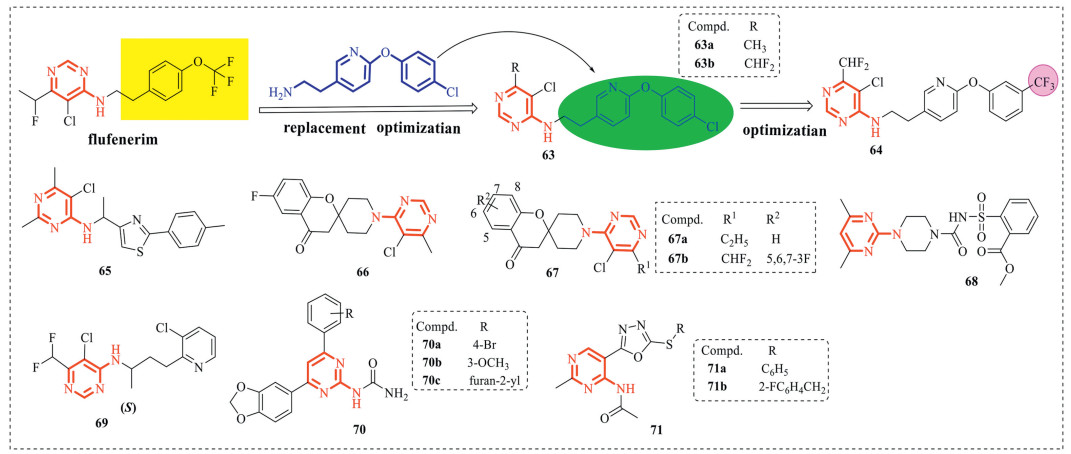 For instance, Guan et al. [96] substituted the 1-(4-(difluoromethoxy)phenyl)propyl group attached to N in the diflumetorim molecule with 2-(6-phenoxypyridin-3-yl)ethan-1-amine, leading to the identification of compound 63 (Fig. 6). The inhibitory activity of compound 63a against cucumber downy mildew (EC50 = 0.19 mg/L) was notably better than that of diflumetorim (half maximal effective concentration (EC50) = 23.06 mg/L), flumorph (EC50 = 7.77 mg/L), and cyazofamid (EC50 = 1.01 mg/L). Additionally, it showed significant inhibitory activity against southern corn rust and wheat powdery mildew. The structural relationships indicated that the substitution position of the chlorine atom on the phenyl group had a strong influence on the antimicrobial activity of the compounds. Subsequent structural optimization showed that compound 63b with a difluoromethyl group exhibited better inhibitory activity against downy mildew (EC50 = 0.10 mg/L) compared to compound 63a (EC50 = 0.19 mg/L) and common fungicides like diflumetorim, dimethomorph, and cyazofamid (EC50 = 1.0123.06 mg/L). The field efficacy of compound 63b was also superior to compound 63a, cyazofamid, and flumorph, making it a potential candidate as a fungicide [97]. Following the structural optimization of compound 63b in the same year, Guan et al. [98] observed that compound 64 (Fig. 6) demonstrated an EC50 value of 2.16 mg/L against southern corn rust, surpassing the control diflumetorim (EC50 = 53.26 mg/L). It was deemed a promising lead compound for antirust purposes. The conformational relationship indicated that enhancing the fungicidal activity of compound 64 was favored by adding an electron-donating group at the para-position of the benzene ring, an electron-withdrawing group at the meta-position of the benzene ring, and substituting the pyrimidine amine group at the 4-position on the pyridine ring. Yan et al. [99] added the pyrimidine ring containing the phenyl thiazole group to pyrimidine ring 2 of diflumetorim, and discovered that compound 65 (Fig. 6) had a greater effect on the antimicrobial activity of Puccinia sorghi (EC50 = 0.93 mg/L) and Blumeria graminis (EC50 = 1.24 mg/L) compared to diflumetorim, tebuconazole, and flusilazole. The cytotoxicity tests revealed that compound 65 was less toxic than diflumetorim. Compound 66 (Fig. 6) [100] demonstrated outstanding fungicidal activity against Pseudoperonospora cubensis (EC50 = 0.422 mg/L), surpassing the effectiveness of commercially available fungicides such as cyazofamid, flumorph, and diflumetorim. The activity of the entire molecule is thought to be boosted by the presence of the substituted F atom on the phenyl ring in compound 66. Additionally, compound 67 (Fig. 6) [101] demonstrated control efficacy exceeding 80% against cucumber downy mildew, wheat powdery mildew, and colletotrichum orbiculare.