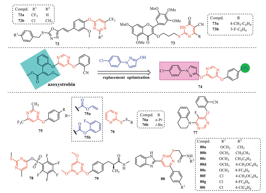 Compounds 72–73 (Fig. 7) were discovered to have enhanced fungicidal activity by incorporating plant-derived ferulic acid and myricetin active substances into the pyrimidine structure [107,108], based on the concept of green pesticides. Among them, compound 72a (Fig. 7) demonstrated excellent antifungal activity against Phomopsis sp. with an EC50 value of 12.64 mg/L, which was better than that of pyrimethanil (EC50 = 35.16 mg/L) and hymexazol (EC50 = 27.01 mg/L). Compound 72b (Fig. 7) exhibited potent antimicrobial activity against Xanthomonas axonopodis in vitro, demonstrating an inhibition rate of 85.76%, surpassing that of thiodiazole copper (76.59% at 100 mg/L). Compound 73a (Fig. 7) displayed an outstanding inhibitory effect against X. axonopodis (EC50 = 15.5 mg/L) and Xanthomonas oryzae (EC50 = 14.9 mg/L). Its therapeutic (42.4%) and protective (49.2%) effects against Xanthomonas oryzae were superior to those of bismerthiazol (35.2%) and thiadiazole copper (30.8%). Compound 73b (Fig. 7) showed significant antimicrobial activity against Ralstonia solanacearum (EC50 = 14.7 mg/L), which was better than bismerthiazol (EC50 = 71 mg/L) and thiadiazole copper (EC50 = 52.7 mg/L). Zhang et al. [109] utilized an intermediate derivatization method to replace the methoxy acrylate in azoxystrobin with 1-(4-chlorophenyl)-1H-pyrazol-3-ol, resulting in compound 74 (Fig. 7). This compound exhibited strong fungicidal activity against cucumber downy mildew (EC50 = 1.22 mg/L), outperforming diflumetorim (EC50 = 23.06 mg/L) and flumorph (EC50 = 7.77 mg/L). The positioning of an electron-withdrawing substituent in the para-position of the phenyl ring and the attachment of the pyrimidine ether group to the 3-position of the pyrazole ring were identified as key factors in enhancing fungicidal activity.