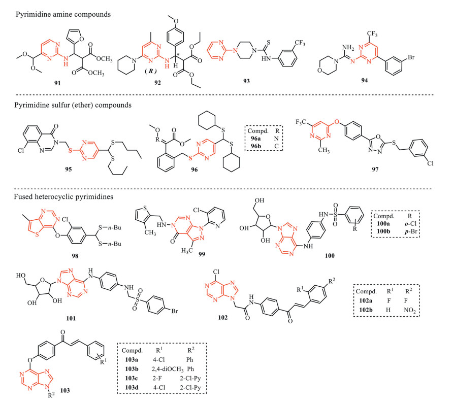 • Pyrimidine, with the chemical formula C4H4N2, is a nitrogen heterocyclic aromatic compound that results from replacing two carbon atoms with two nitrogen atoms in the interstitial position of the benzene molecule. They are present in caffeine, vitamin B1, theophylline, and nucleic acids such as uracil, cytosine, and thymine [1,2]. Pyrimidine heterocyclic compounds are extensively employed in pesticides and medicine due to their high selectivity, low toxicity, and ease of structural modification [3,4]. The search was carried out on the SciFinder research platform using keywords such as pyrimidine compounds, insecticides, fungicides, herbicides, antiviral agents, and plant growth regulators. A total of 882 literature sources were found on the investigation of compounds with pyrimidine structure in pesticides from 2014 to 2024. The number of literature reporting pyrimidine compounds with insecticidal activity is 101, with fungicidal activity is 380, with herbicidal activity is 344, with antiviral activity is 23, and with plant growth regulating function is 34. Pyrimidine compounds are mainly used in fungicides and herbicides, followed by insecticides, and are less researched in antiviral agents and plant growth regulators [5,6], In world pesticide patents, heterocyclic compounds accounted for more than 90%, with more than 60 pesticide commodities containing pyrimidine structure, including 13 fungicides, more than 40 herbicides and herbicide antidotes, and 8 insecticides. This trend is similar to the amount of literature published on pyrimidine compounds (Fig. S1 in Supporting information).