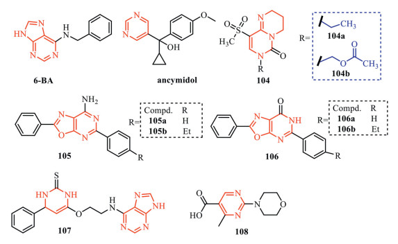 Despite the limited literature on plant growth regulators containing pyrimidine structures, there have been a few with superior activity in recent years. For example, compound 104 (Fig. 9) [146], which has a growth hormone-like function, demonstrates growth regulating activity in tomato at a concentration of 109 mol/L. Compounds 105 and 106 (Fig. 9) [147], possessing both cytokinin and growth hormone functions, stimulate the growth and development of soybean, wheat, flax, and pumpkin plants at a concentration of 109 mol/L. Compound 107 (Fig. 9) [148] exhibits outstanding cytokinetic activity, making it a valuable resource for promoting rooting, strengthening seedlings, increasing yields, and enhancing the quality of various crops and plants such as grains, cotton, fruits, and vegetables. It can be applied through seed treatment or spraying on roots and stems. The use of uridine analogs can improve stress tolerance, reduce stress, repair stress-induced damage, and prevent stress. In addition, compound 108 (Fig. 9) [149] has been proven to boost the growth and yield of tomatoes. It raised the germination rate of tomato seeds from 18.9% to 38.6%, seedling height from 29.9% to 70.1%, yield from 20.5% to 56.8%, and the average weight of the fruit from 3.8% to 16.3% at a concentration of 0.1%.