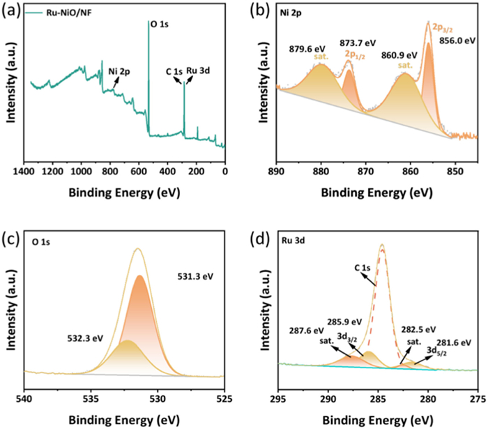 To investigate both the composition of Ru-NiO/NF and its surface chemical valence states, the catalyst was analyzed by X-ray photoelectron spectroscopy (XPS). The XPS full-spectrum scan of Ru-NiO/NF is shown in Fig. 2a to further verify the presence of Ru, Ni, and O elements. In Fig. 2b, a total of four peaks were fitted to the spectrum about Ni 2p, in which the fitted peaks with binding energies at 856.0 and 873.7 eV were attributed to Ni 2p3/2 and 2p1/2, respectively [29], and which were derived from NiO [30,31]. In addition, the binding energy fitting peaks at 860.9 and 879.6 eV were attributed to the satellite peaks corresponding to NiO [32]. Fig. 2c presents the O 1s spectrum of the sample deconvolved into 2 characteristic peaks, which proves the fact that the oxidized state of nickel [33]. As shown in Fig. 2d, the binding energy of the convolution at both 281.6 and 285.9 eV can be attributed to Ru 3d5/2 and Ru 3d3/2, which results correspond to Ru-O bonds. In addition, the fitted peaks at 282.5 and 287.6 eV are the satellite peaks corresponding to Ru 3d5/2 and Ru 3d3/2, whereas the rest of the peaks are attributed to the C 1s [34], and the rest of the peaks are attributed to the C 1s, and this result also suggests that, the Ru in the catalysts in the catalyst is in the oxidized state.
