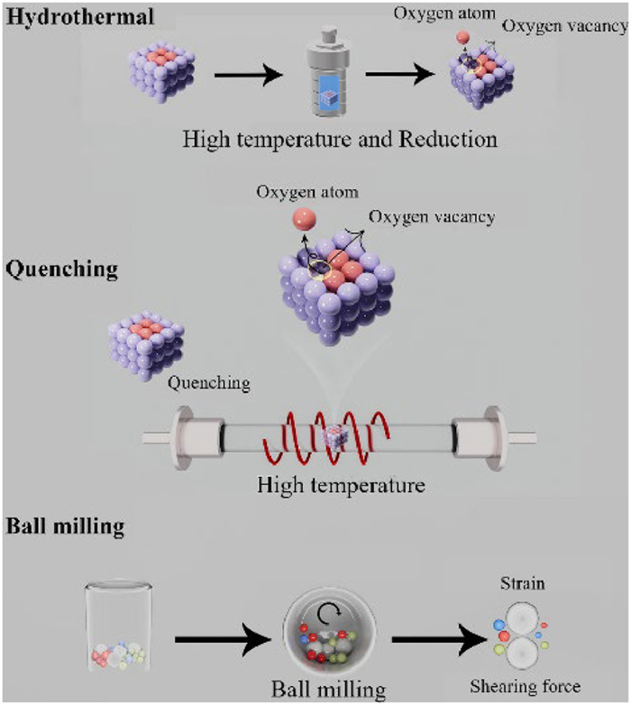 Mechanochemistry serves as a prevalent technique for the synthesis of materials with oxygen vacancies. The mechanical ball milling process involves the treatment of diverse materials within sealed containers, offering benefits such as ease of operation, straightforward post-treatment, cost-effectiveness, and environmental sustainability [72]. The application of shear stress and compression through ball milling induces lattice distortion within the material. This mechanical strain displaces oxygen atoms from their original lattice sites, thereby generating oxygen vacancies (Fig. 1).