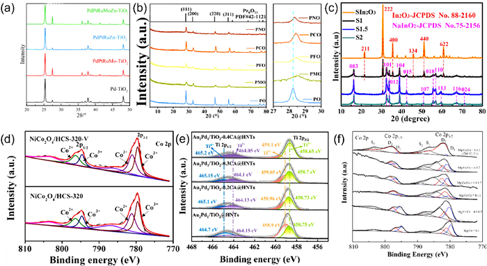 Figure 2. (a) XRD patterns of high entropy alloy catalysts. Reprinted with permission [81]. Copyright 2021, Elsevier. (b) XRD patterns of doping of Pr6O11 by different metals. Reprinted with permission [59]. Copyright 2024, Elsevier. (c) XRD patterns of mesoporous SInO2 and NaInO2 compounds with different molar ratios. Reprinted with permission [82]. Copyright 2018, Elsevier. (d) XPS spectra of NiCo2O4/HCS-320-V. Reprinted with permission [83]. Copyright 2018, Elsevier. (e) XPS spectra of Au2Pd1/TiO2-xCA@HNTs. Reprinted with permission [85]. Copyright 2023, Elsevier. (f) XPS of Co 2p level for Mg-Co-Ce composites. Reprinted with permission [86]. Copyright 2022, Elsevier.3.2 X-ray photoelectron spectroscopy