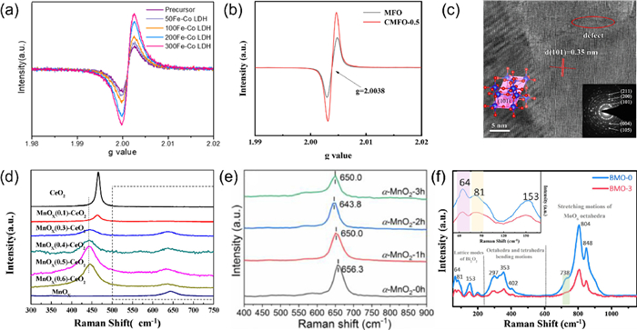 Figure 3 (a) EPR images of Fe-Co LDH at different calcination temperatures. Reprinted with permission [48]. Copyright 2021, Elsevier. (b) EPR spectra of MFO and CMFO-0.5. Reprinted with permission [49]. Copyright 2022, Elsevier. (c) HRTEM images of Fe/TiO2-x-S. Reprinted with permission [91]. Copyright 2022, Elsevier. (d) Raman spectra of MnOx(z)-CeO2. Reprinted with permission [93]. Copyright 2018, Elsevier. (e) Raman spectra of α-MnO2 with different reduction times. Reprinted with permission [94]. Copyright 2023, Elsevier. (f) Raman spectrum of BMO-0 and BMO-3. Reprinted with permission [95]. Copyright 2019, Elsevier.