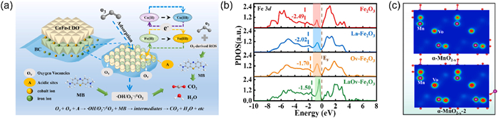 Figure 4 (a) The Proposed mechanisms of MB degradation in CoFe-LDO-BC + O3 system. Reprinted with permission [55]. Copyright 2023, Elsevier. (b) PDOS of Fe 3d. Reprinted with permission [97]. Copyright 2024, Elsevier. (c) The charge density of α-MnO2-x and α-MnO2-x-2. Reprinted with permission [98]. Copyright 2024, Elsevier.