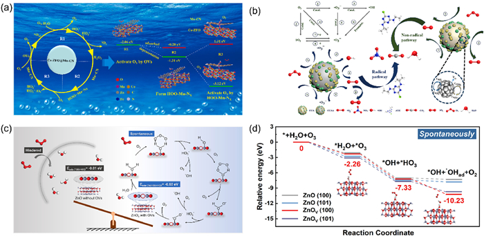 Figure 5 (a) Catalytic ozonation mechanism over Co-ZFO@Mn-CN. Reprinted with permission [99]. Copyright 2023, Elsevier. (b) The mechanism diagram of ROS production and ATZ degradation in CCA/O3 and CCAA/O3. Reprinted with permission [100]. Copyright 2024, Elsevier. (c) Possible interface catalytic mechanisms. Reprinted with permission [105]. Copyright 2024, Elsevier. (d) Relative energies of different coordinates and interfacial reaction pathways on zinc oxides. Reprinted with permission [106]. Copyright 2024, Elsevier.