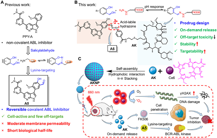 Figure 1.  Schematic diagram of pH-responsive on-demand prodrug release strategy of AKNP. (A) Structures of previously reported BCR-ABL inhibitors including PPY-A and A5. (B) Chemical structure of prodrug AK and pH-responsive strategy for on-demand release by using acid-labile hydrazone to bind the aldehyde group in A5. (C) The design strategy of AKNP is based on the combination of prodrug AK and photosensitizer Ce6. After tail vein injection of AKNP, these nanoparticles can effectively accumulate at the tumor site. Upon cellular uptake, AKNP could produce ROS with light irradiation, leading to DNA damage. Meanwhile, the released A5 reversible-covalently inhibits BCR-ABL kinase, further inhibiting tumor growth.