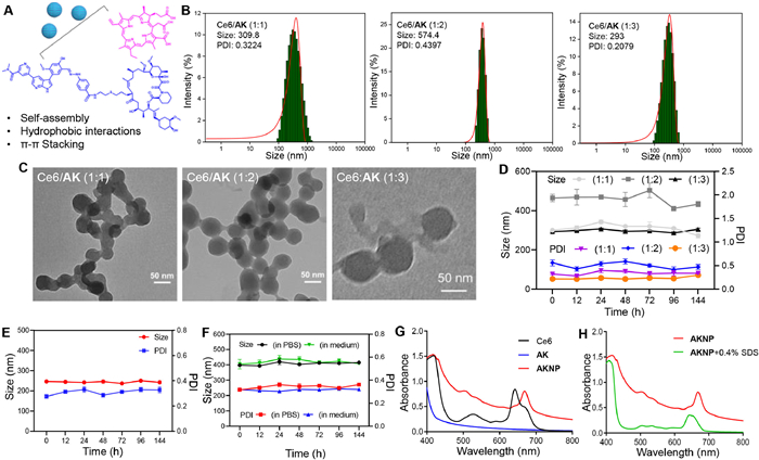 Figure 2  Characterizations of AKNP. (A) Schematic illustration of the self-assembly between Ce6 and AK (giving AKNP) through π-π stacking and hydrophobic interactions. (B, C) Particle size histograms and TEM images of nanoparticles prepared at different molar ratios of Ce6 to AK in aqueous solution. (D) The changes of nanoparticles on particle size and PDI in 6 days. Stability test of AKNP incubated in (E) water and (F) PBS or DMEM, for 6 days. (G) Absorbance spectra of Ce6, AK, and AKNP. (H) Absorbance spectra of AKNP with or without treatment with 0.4% SDS. Data are presented as mean ± standard deviation (SD) (n = 3).