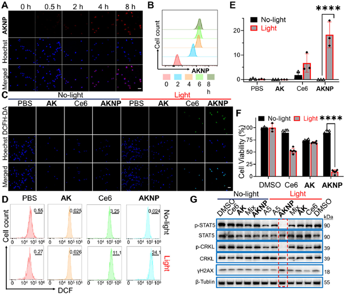 Figure 3.  Antitumor activities of AKNP in vitro. (A) CLSM images of AKNP internalization in K562 tumor cells at different time points. Scale bar: 50 µm. (B) FACS analysis of cellular uptake of AKNP in K562 cells. (C) Confocal images of ROS generation in K562 cells after different treatments. Scale bar: 50 µm. (D, E) Quantitative FACS results of ROS generation in K562 cells after different treatments (n = 3). The graph in (E) was plotted from data extrapolated from (D). (F) Cell viability data of Ce6, AK, and AKNP in K562 cells with and without light irradiation (n = 6). (G) WB analysis of AKNP-treated K562 cells, with or without light irradiation. For all light treatments, cells were incubated with the drug for 12 h (for cellular uptake) before 2-min light irradiation (at 660 nm), followed by an additional 12-h cell incubation. ****P < 0.0001. Data are presented as mean ± SD.