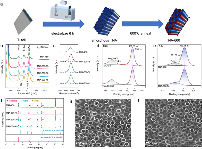 Figure 1.  Synthesis and characterization of TNAs. (a) Synthesis strategy of TNA-450 and TNA-600. (b, c) Raman spectra. (d, e) XPS spectra of Ti 2p and O 1s for TNA-450 and TNA-600–30. (f) XRD Pattern of TNAs. (g, h) SEM image of TNA-450 and TNA-600–30.