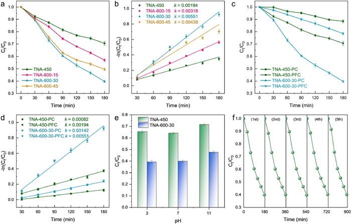 Figure 2.  (a) Degradation efficiency of SMR by different TNAs photoanodes in PFC system (C0 = 10 mg/L). (b) Pseudo-first-order kinetics curve of different TNAs photoanodes in PFC system. (c) Degradation efficiency of SMR by two kinds of photoanode in different systems (C0 = 10 mg/L). (d) Pseudo-first-order kinetics curve of different TNAs photoanode in different systems. (e) Effect of initial solution pH on SMR degradation. (f) The degradation efficiency of SMR by TNA-600–30 for 5 cycles.