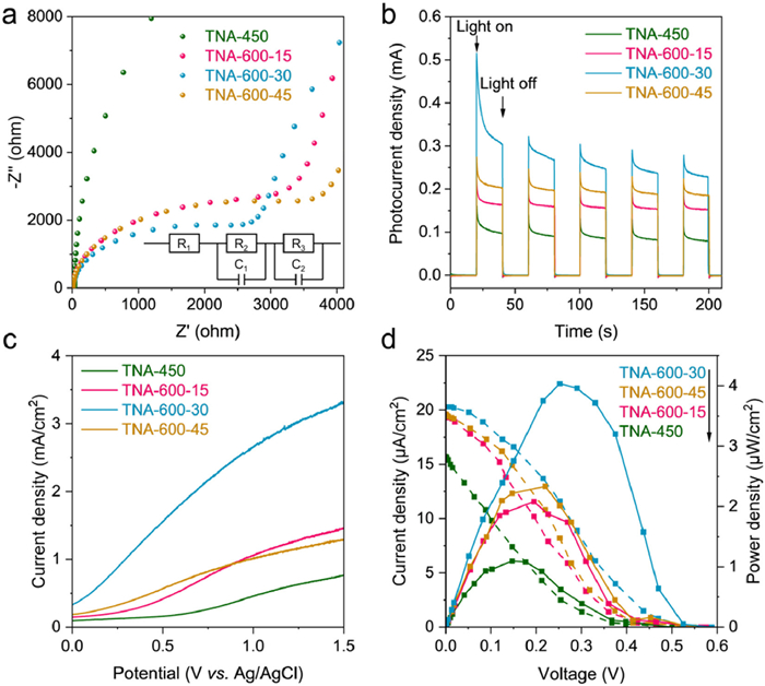 Figure 3.  (a) Nyquist plots, (b) transient photocurrent curves of TNA-450 and TNA-600. (c) LSV curves of TNA-450 and TNA-600 under illumination. (d) J-V curves and corresponding power densities of PFC based on TNA-450 and TNA-600.
