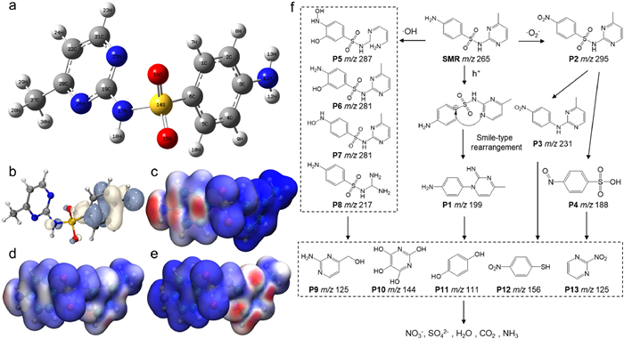 Figure 4  (a) Optimized SMR structure. (b) HOMO, (c) f, (d) f0 and (e) f+ of SMR. (f) Possible degradation pathways.