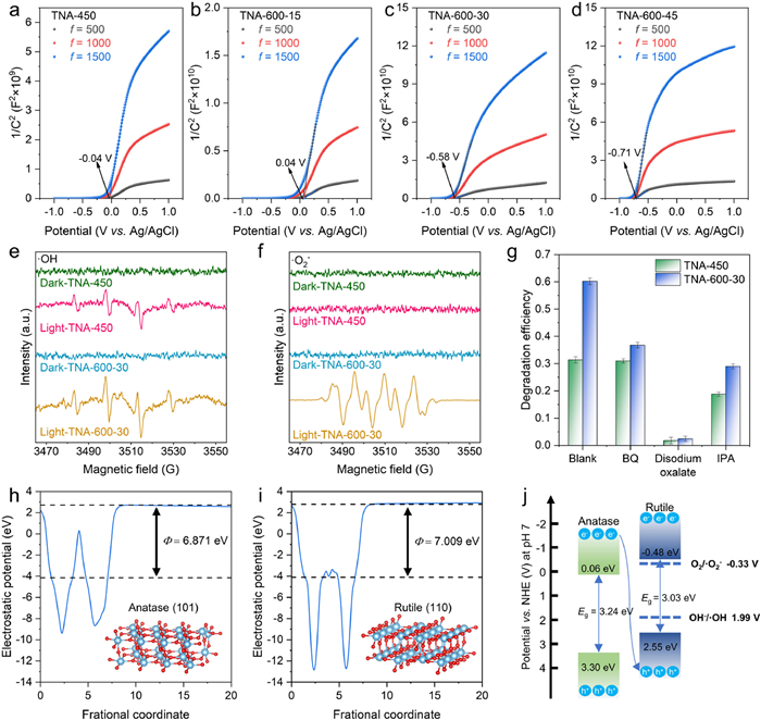 Figure 5  Mott-schottky curve based on (a) TNA-450, (b) TNA-600–15, (c) TNA-600–30 and (d) TNA-600–45. Work function of (e) Anatase (101) crystal facet and (f) Rutile (110) crystal facet. (g) Effect of different scavengers on SMR degradation. (h) OH ESR spectra of TNAs. (i) O2 ESR spectra of TNAs. (j) Band plot of hetero-phase homojunction TNAs.
