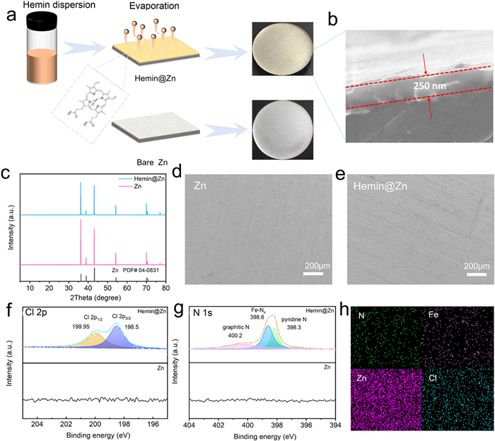 Figure 1.  (a) Fabrication schematic and optical pictures of Hemin@Zn. (b) Cross-sectional SEM image of the Hemin@Zn. (c) XRD patterns, (d, e) SEM images of bare Zn and Hemin@Zn anode. (f, g) High-resolution N 1s and Cl 2p spectra of bare Zn and Hemin@Zn. (h) EDS mapping images of Hemin@Zn.
