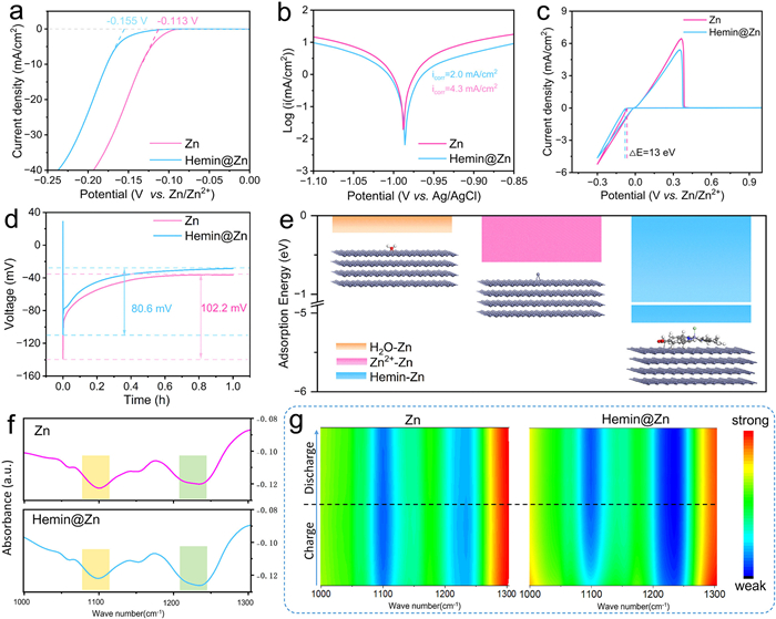 Figure 2  (a) LSV, (b) Tafel, (c) CV curves and (d) zinc deposition curves of the Hemin@Zn anode and the Zn anode. (e) Adsorption energy of the H2O molecule, Zn2+ and Hemin molecule on the Zn anode. (f, g) In-situ FTIR spectra of H3O+ and SO₄2- on the surface of Hemin@Zn anode and the Zn anode.