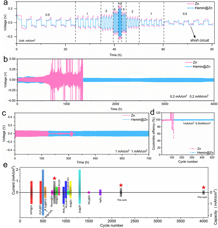 Figure 3  (a) Rate performance of Zn||Zn and Hemin@Zn||Hemin@Zn symmetric cells. Plating/stripping cycle abilities of Zn symmetric cells at (b) 0.2 mA/cm2 with a capacity of 0.2 mAh/cm2, (c) 1 mA/cm2 with a capacity of 1 mAh/cm2. (d) CE of Zn//Cu asymmetric cells during long-term cycling. (e) Schematic illustration of cycling performance comparison in previous reports.