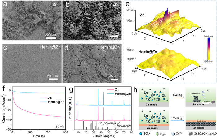Figure 4  SEM images of (a, b) Zn foil and (c, d) Hemin@Zn anode after 150 cycles in asymmetric cells. (e) AFM images of cycled Zn electrodes and Hemin@Zn. (f) CA curves of Zn||Zn and Hemin@Zn||Hemin@Zn symmetric cells. (g) XRD patterns of symmetric cells after 150 cycles. (h) Schematic illustration of the mechanism of bare Zn anode and Hemin@Zn anode.