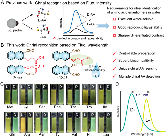 • Amino acids as the fundamental building blocks of functional macromolecules in biology, are essential for protein formation in living organisms [1-3]. They are also critical components in many drug molecules [4]. The chiral recognition of amino acids is pivotal in various fields including the construction of living organisms, the food industry, natural products, and pharmaceuticals [5-7]. However, differentiating among various types of chiral amino acids, particularly between their enantiomeric pairs with similar structures, presents significant challenges due to the overlapping nature of their characteristic spectra [8]. Various spectroscopic methods have been employed for enantioselective analysis of amino acids, including chromatography [9], circular dichroism (CD) [10], absorption [11], phosphorescence [12], fluorescence [13], and nuclear magnetic resonance (NMR) [14]. Among these techniques, fluorescence analysis stands out for its rapid analysis and direct imaging capabilities of chiral substrates [15,16]. Many research laboratories focus on the enantioselective fluorescence recognition of free amino acids [17-20]. Currently, most chiral recognition methods for amino acids rely on the intensity difference between two enantiomers mediated by fluorescent probes [21,22]. However, due to the inherent variability in fluorescence intensity, the accuracy and reproducibility of fluorescence-based methods can be compromised [23]. Moreover, these chiral fluorescent receptors typically require a known concentration of amino acid enantiomers for measurement [24].