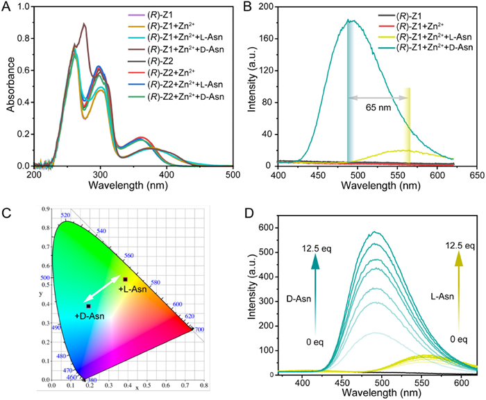 Figure 2  (A) UV–vis absorption spectra of (R)-Z1, (R)-Z1+Zn2+, (R)-Z1+Zn2++ D-/L-Asn, (R)-Z2, (R)-Z2+Zn2+, (R)-Z2+Zn2++ D-/L-Asn in water. (B) Fluorescence spectra of (R)-Z1, (R)-Z1+Zn2+, (R)-Z1+Zn2++ D-/L-Asn (excited by 317 nm). (C) CIE of (R)-Z1+Zn2++ D-/L-Asn, with varying emission wavelength in aqueous solution in accordance with (B). (D) Fluorescence spectra of (R)-Z1 with different concentrations of D/L-Asn in the emission window of 450−750 nm (excitation wavelength: 317 nm).
