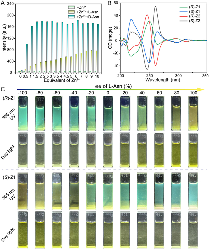Figure 3.  (A) The maximum fluorescence intensity of (R)-Z1 (1 equiv.) + L/D-Asn (25 equiv.) versus the equivalent amount of Zn2+ex = 317 nm, slits: 5/5 nm). (B) CD spectra of (R)-Z1, (S)-Z1, (R)-Z2 and (S)-Z2 (2.0 × 10-5 mol/L, pH 7.4). (C) The emission color changes of (R)-Z1 and (S)-Z1 with the ee of L-Asn (%).