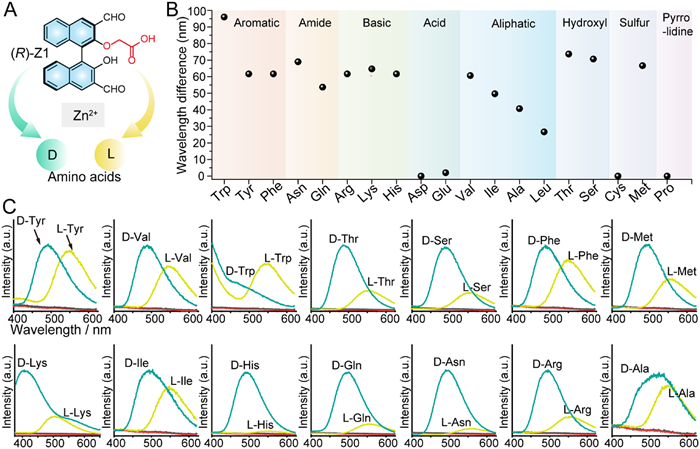 Figure 4  (A) The chemical structure of the fluorescent probe used for the detection of nineteen chiral amino acids. (B) Emission wavelength difference for chiral amino acids grouped into various structural categories. (C) Fluorescence spectra of (R)-Z1, (R)-Z1 +Zn2+, (R)-Z1 + Zn2++D-/L-amino acids (excited by 317 nm). The red line indicates (R)-Z1, and the black line indicates (R)-Z1+Zn2+.
