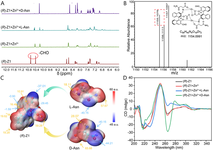 Figure 5  (A) 1H NMR spectra of the (R)-Z1 (line 1), (R)-Z1 (2 mmol/L, 1 equiv.) + Zn2+ (1 equiv.) (line 2), (R)-Z1 (2 mmol/L, 1 equiv.) + Zn2+ (1 equiv.) + L-Asn (12.5 equiv.) (line 3), (R)-Z1 (2 mmol/L, 1 equiv.) + Zn2+ (1 equiv.) + D-Asn (12.5 equiv.) (line 4), the solvents are pH 7.4 HEPES buffer prepared by D2O. (B) HRMS of the mixture of (R)-Z1 (2 mmol/L, 1 equiv.), Zn2+ (1 equiv.) and D-Asn (12.5 equiv.), the solvent is pH 7.4 HEPES buffer. (C) The calculated distribution of ESP in (R)-Z1, D-Asn, and L-Asn at B3LYP/Def2SVP level. (D) CD spectra of (R)-Z1 (2.0 × 10-5 mol/L, pH 7.4) + Zn2+ in the presence of D- and L-Asn.