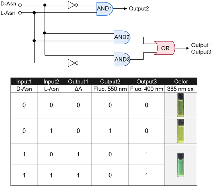 By constructing multiple logic gates, including AND, OR, and INHIBIT, we achieved fluorescence visualization screening of Asn enantiomers. Utilizing the principles of Boolean algebra, molecular logic gates convert binary chemical signals into corresponding binary outputs, thereby enabling the development of intelligent sensors. We designed a combination of two or three simple logic gates to transform two inputs into three distinct output signals. Specifically, the presence and absence of L- and D-Asn are defined as "1" and "0", respectively, serving as inputs. As illustrated in Fig. 6, the table summarizes the truth values for these logic gates, demonstrating the probe's responses under various input conditions. In the absence of amino acids, no change in ΔA was observed, and no emission peaks were detected, resulting in the PASS 0 gate output (0, 0, 0). The presence of D-Asn, whether in enantiomerically pure solutions or racemic mixtures, triggers an output signal of (1, 0, 1). An enantiomerically pure L-Asn solution produces an output signal of (0, 1, 0). Representative colors in the truth table include bright yellow for L-Asn and cyan for D-Asn. This molecular circuit holds significant potential for intelligent analysis of enantiomeric purity in chiral compounds through fluorescence emission color identification.