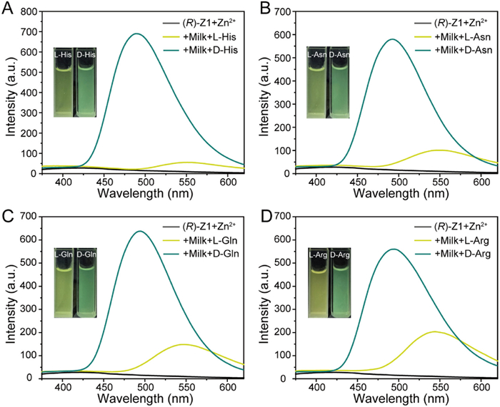 Figure 7.  Fluorescence response of (R)-Z1+Zn2+ to D-/L-amino acids in milk: (A) His, (B) Asn, (C) Gln, and (D) Arg. Inset images: Corresponding luminescent images of D-/L-amino acids excited by 365 nm laser.